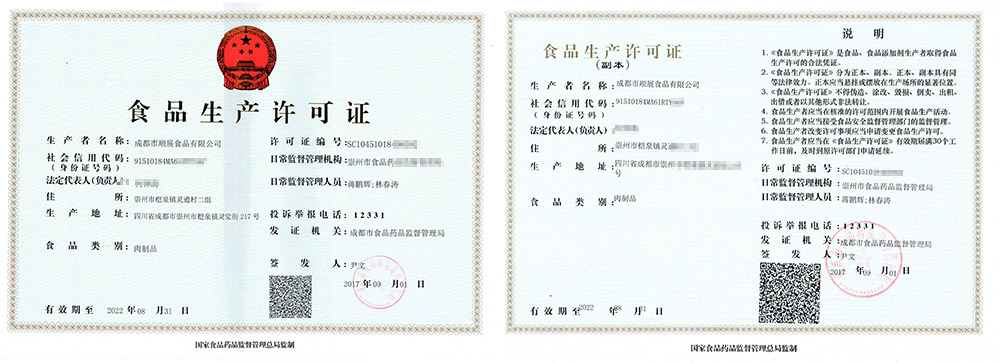 华盛兴邦食品生产许可证案例介绍,成都市顺展食品有限公司生产许可证证书展示,咨询热线:181-0821-4725