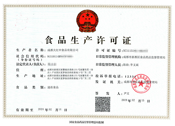 成都大红中食品有限公司,经营范围:速冻调制食品和速冻面米制品制售。