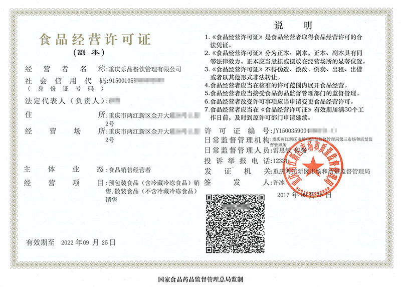 重庆乐品餐饮管理有限公司经营范围食品销售经营,餐饮管理。经营许可证办理。