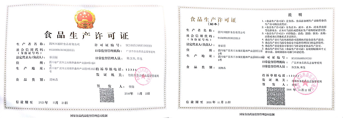 华盛兴邦咨询生产许可证案例展示:四川川酿轩食品有限公司调味品生产许可证