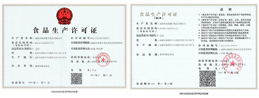 华盛兴邦食品生产许可证案例介绍,成都兴海韵魔芋制品有限公司生产许可证展示