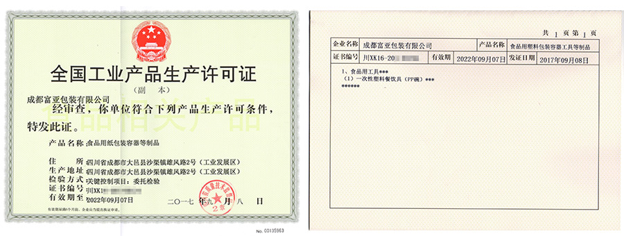 华盛兴邦生产许可证案例介绍,成都富亚包装有限公司工业产品生产许可证展示