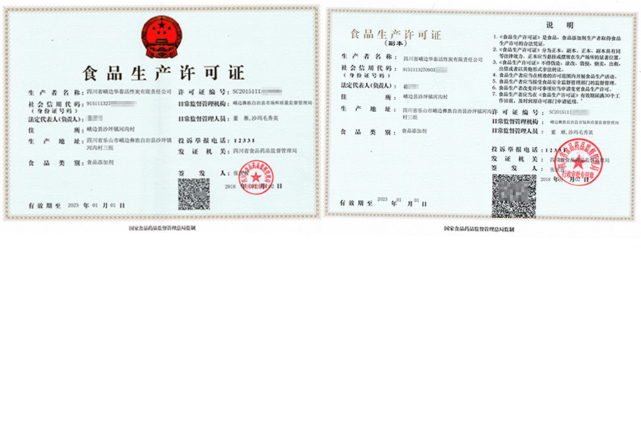 华盛兴邦食品生产许可证案例介绍,四川省峨边华泰活性炭有限责任公司食品生产许可证展示