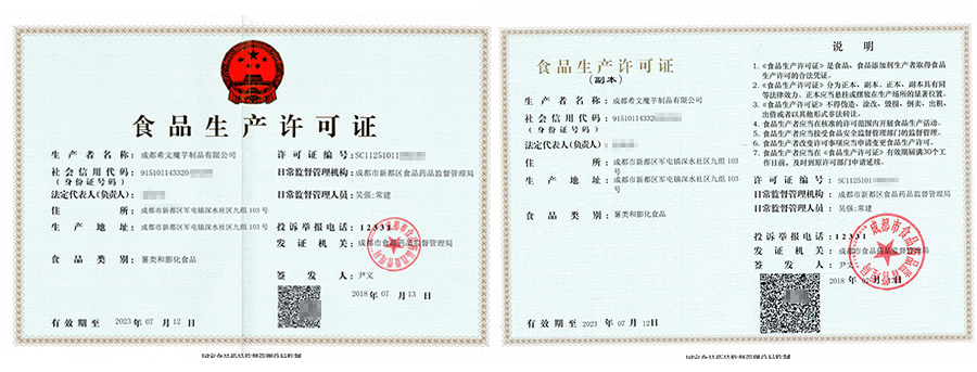 华盛兴邦食品生产许可证案例介绍,成都希文魔芋制品有限公司生产许可证展示。咨询热线:181-0821-4725