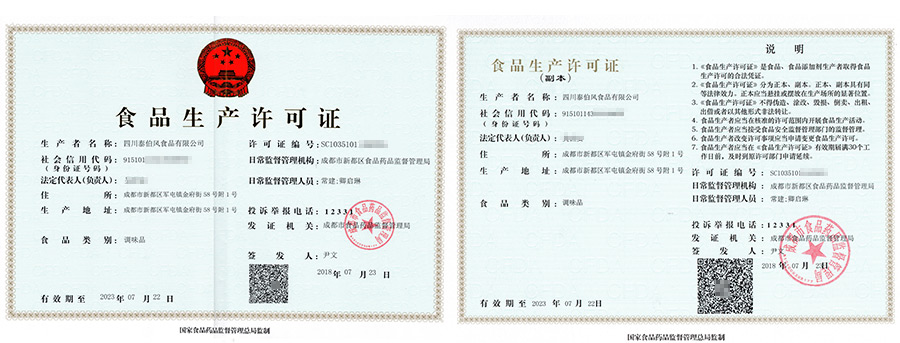 华盛兴邦食品生产许可证案例介绍,四川泰伯风食品有限公司食品生产许可证展示