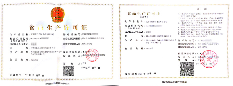 华盛兴邦食品生产许可证案例介绍,成都市竹香园食品有限公司生产许可证展示