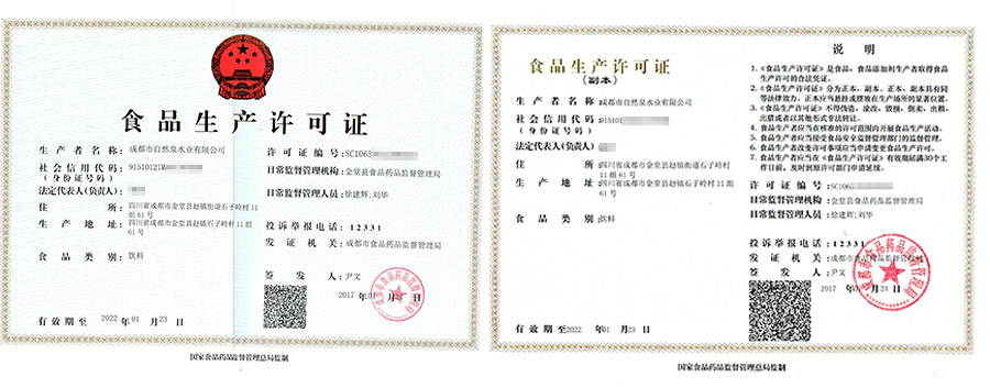 华盛兴邦食品生产许可证案例介绍,成都市自然泉水业有限公司生产许可证证书展示。咨询热线:181-0821-4725