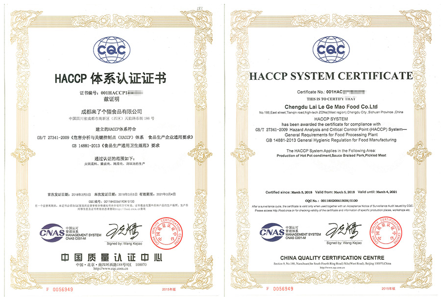 华盛兴邦HACCP体系认证证书案例介绍,成都来了个猫食品有限公司体系证书展示