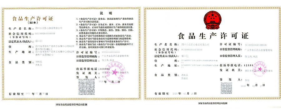 华盛兴邦食品生产许可证案例介绍,成都小幺食铺食品有限公司生产许可证展示,咨询热线:181-0821-4725