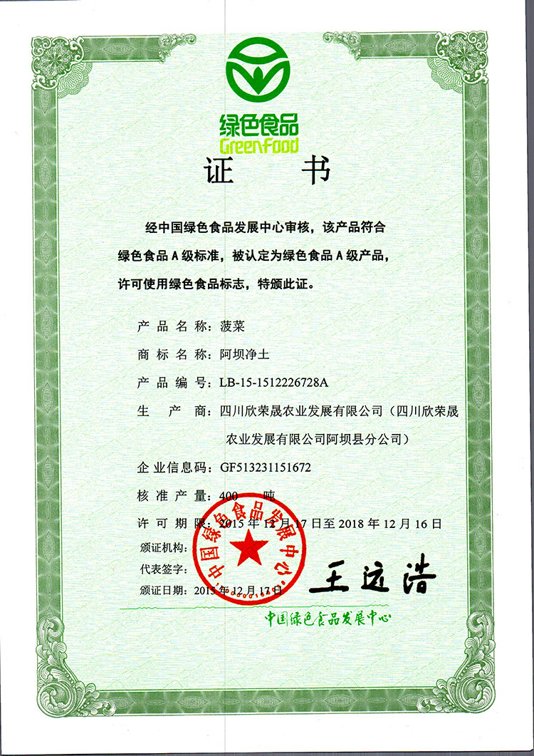 四川欣荣晟农业发展有限公司获得绿色食品证书