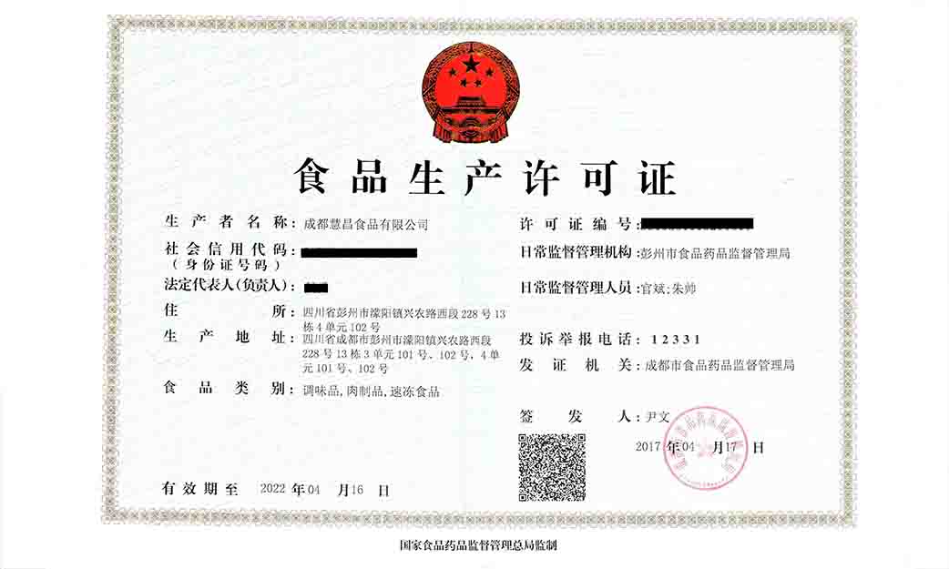 成都慧昌食品有限公司食品生产许可证
