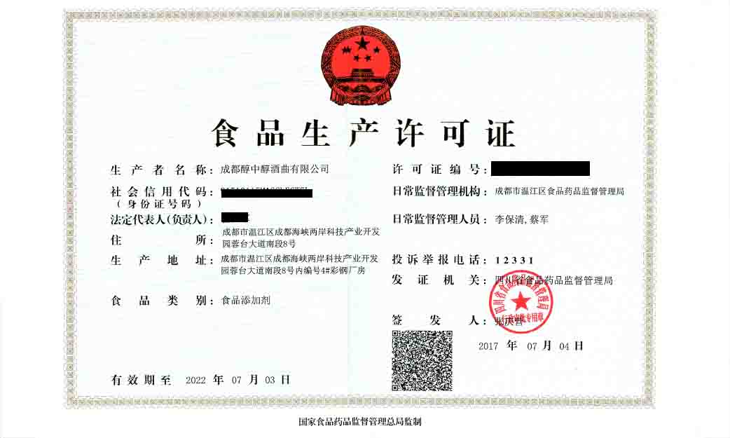 成都醇中醇酒曲有限公司食品生产许可证