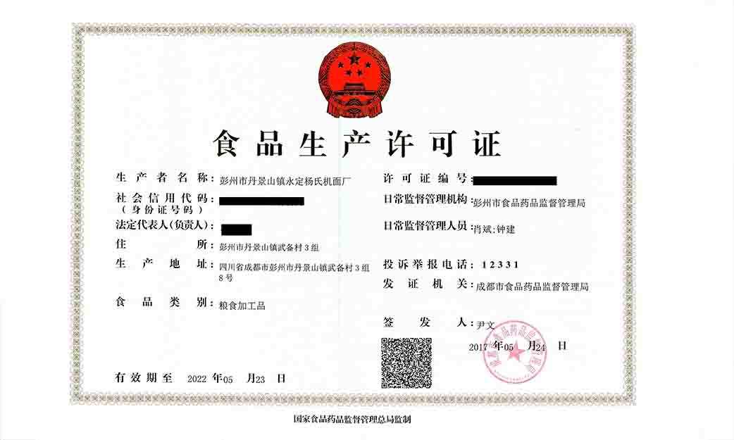 彭州市丹景山镇永定杨氏机面厂食品生产许可证服务