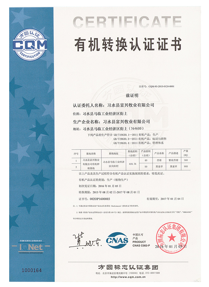 习水县富兴牧业获得有机高粱转换认证证书!!!
