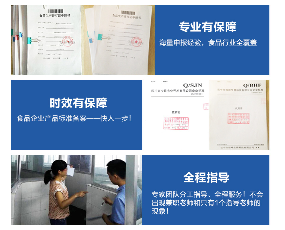 专业从事食品生产许可证(也称SC/QS证、旧称卫生许可证、全称全国工业产品生产许可证)的技术咨询服务及代理申报。包括:按照国家相关规定进行厂房设计、工艺布局及设备选型、检验室(实验室)规划设计及设备配置食品企业标准备案、指导或代为制作申请资料、实地核查过程的沟通、“不符合项”整改辅导工作及产品送检等各项工作。