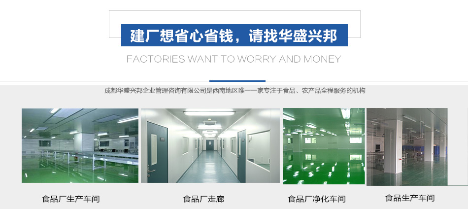 成都华盛兴邦是西南地区唯一一家集:工厂设计、装修施工及生产许可证代申 请等一条龙服务的全产业链服务的公司,更大程度为企业提供便捷、省心、省钱的建厂体验。已服务西南地区上百家食品企业。建厂想省心省钱,请找华盛兴邦!!