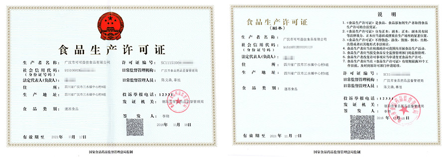 华盛兴邦食品生产许可证案例介绍,广汉市可可益佳食品有限公司食品生产许可证证书展示