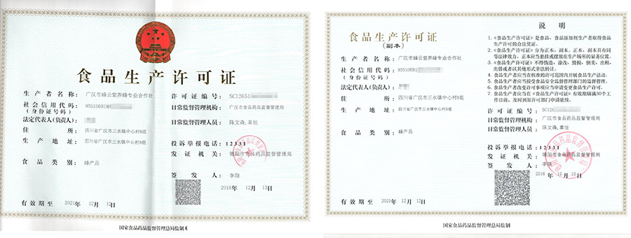 华盛兴邦食品生产许可证案例介绍,广汉市蜂云堂养蜂专业合作社食品生产许可证证书展示