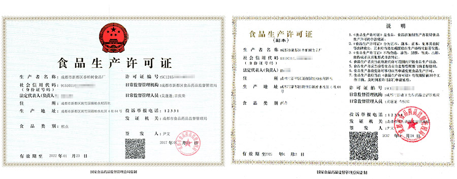 华盛兴邦食品生产许可证案例介绍,成都市新都区香柏树食品厂生产许可证展示,咨询热线:181-0821-4725