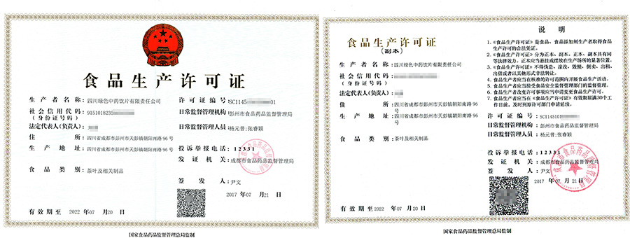 华盛兴邦食品生产许可证案例介绍,四川绿色中药饮片有限责任公司食品生产许可证展示
