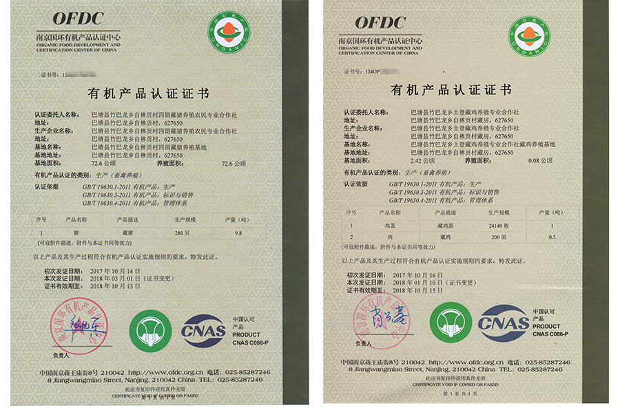华盛兴邦有机产品认证证书案例介绍,巴塘县竹巴龙乡土豋藏鸡养殖专业合作社有机产品认证证书展示
