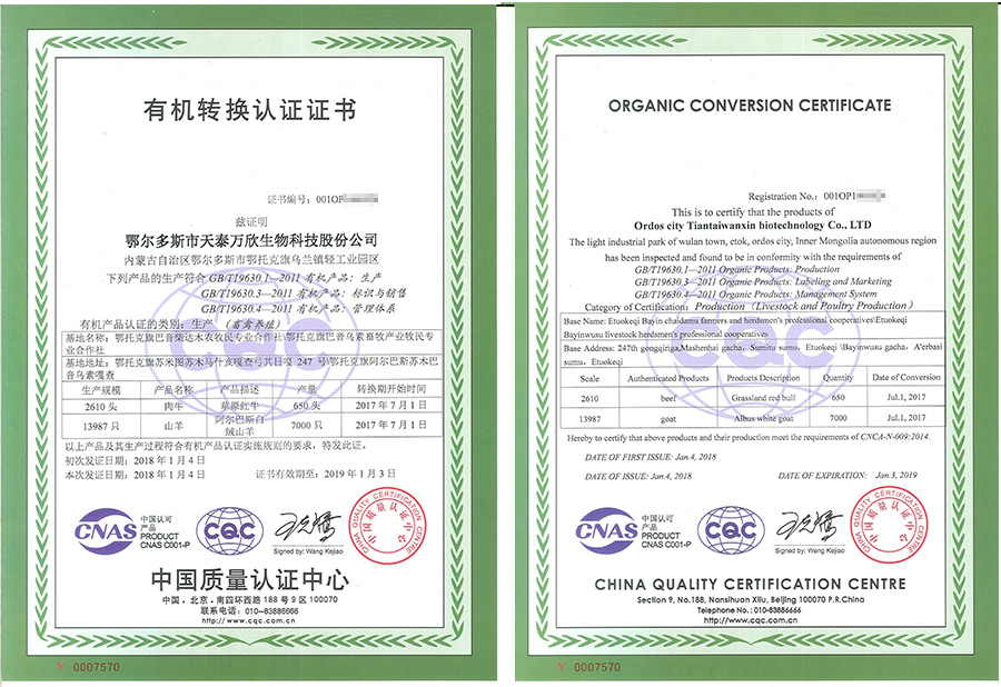 华盛兴邦有机转换证书案例介绍,鄂尔多斯市天泰万欣生物科技股份公司有机转换证书展示