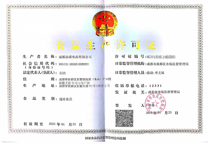 华盛兴邦食品生产许可证案例介绍,成都众诺食品有限公司食品生产许可证展示。咨询热线:181-0821-4725