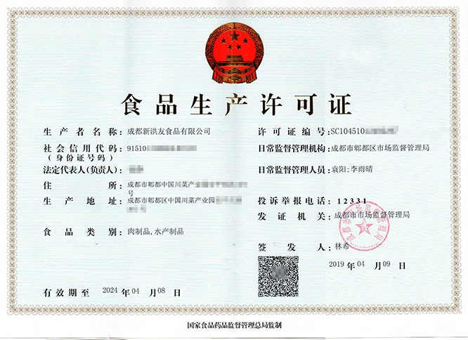 华盛兴邦食品生产许可证案例介绍,成都新洪友食品有限公司食品生产许可证展示。咨询热线:181-0821-4725