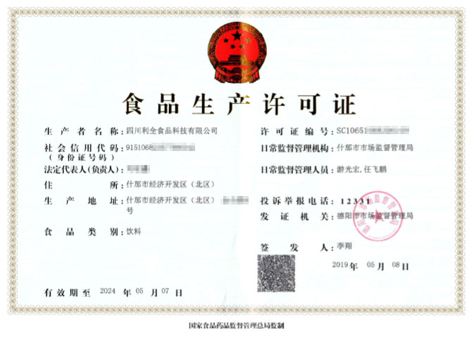华盛兴邦食品生产许可证案例介绍,四川利全食品科技有限公司食品生产许可证展示。