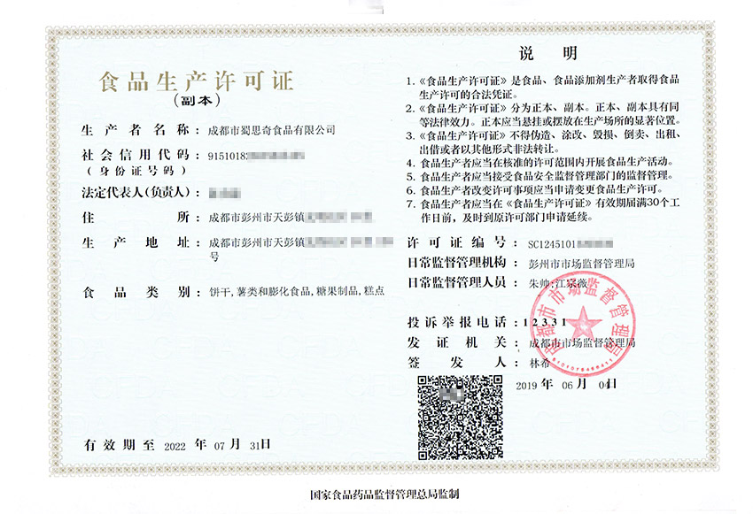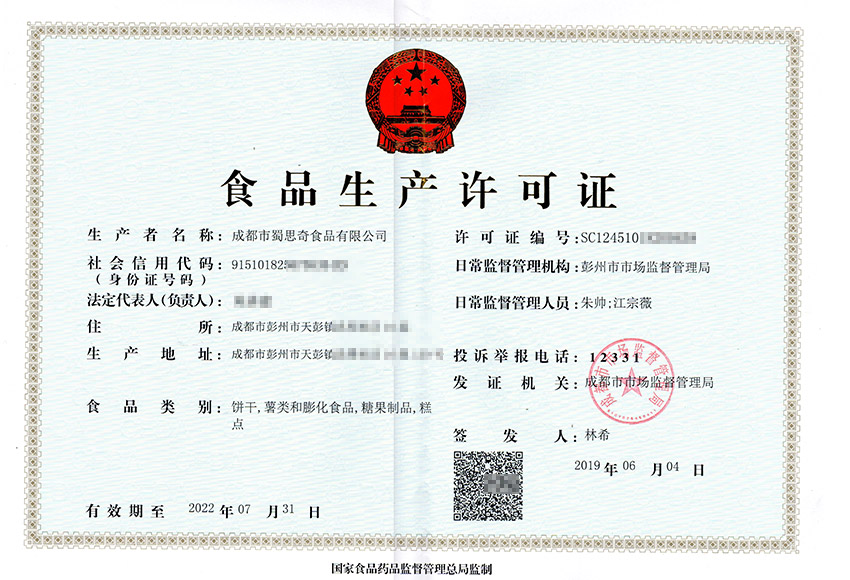 华盛兴邦食品生产许可证案例介绍,成都市蜀思奇食品有限公司食品生产许可证证书展示。咨询热线:181-0821-4725