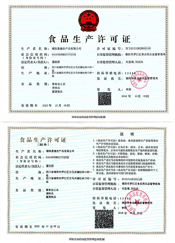 华盛兴邦食品生产许可证案例介绍,德阳易健农产品有限公司食品生产许可证展示。