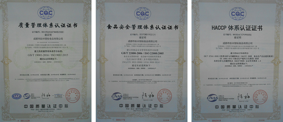 华盛兴邦体系管理证书案例介绍,成都市彭州银裕食品有限公司质量管理体系证书,安全管理体系证书,HACCP体系证书展示。咨询热线:181-0821-4725