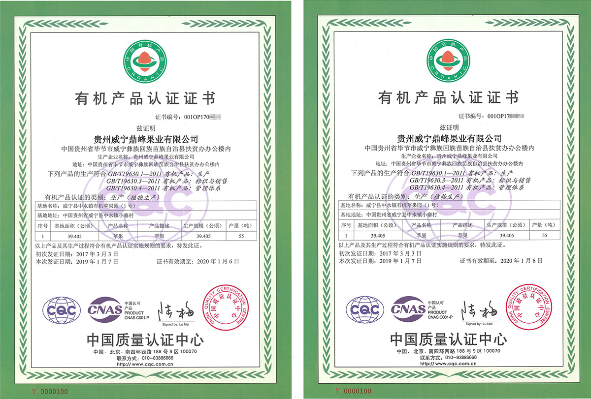 华盛兴邦有机产品认证证书案例介绍,贵州威宁鼎峰果业有限公司有机产品认证证书展示。