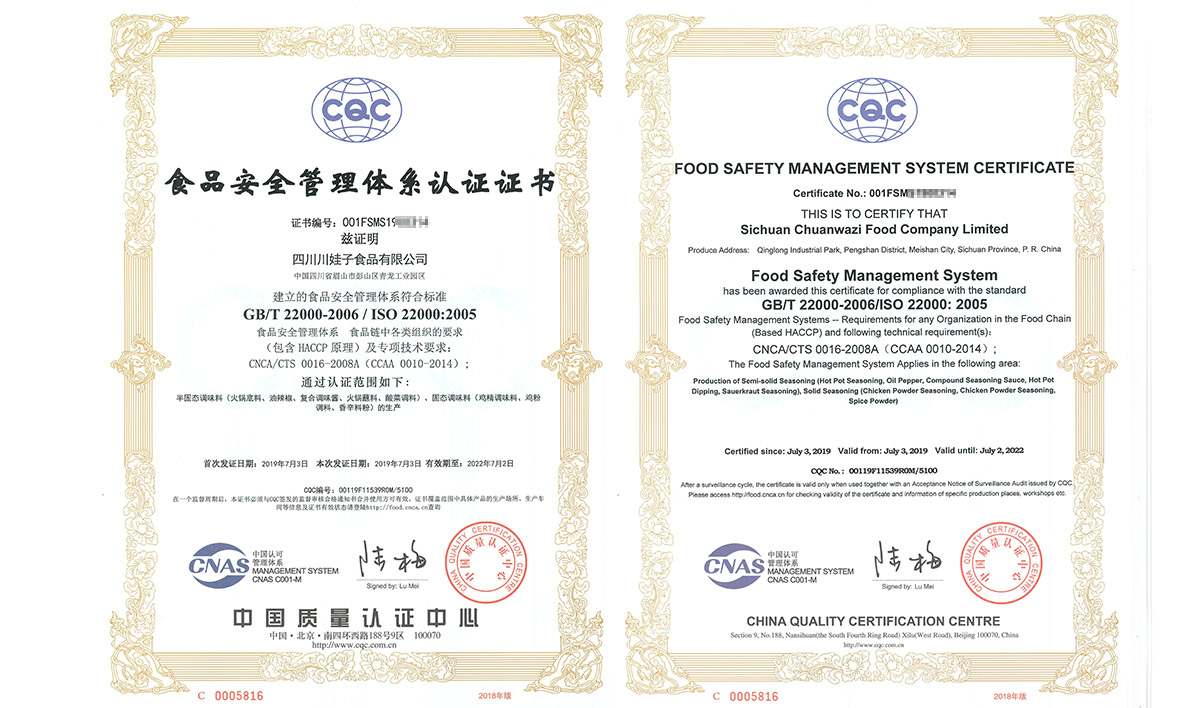 华盛兴邦食品安全管理体系认证证书案例介绍,四川川娃子食品有限公司食品安全管理体系认证证书展示。