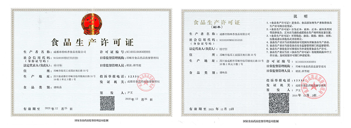 华盛兴邦食品生产许可证案例介绍,成都市柏味香食品有限公司食品生产许可证展示。