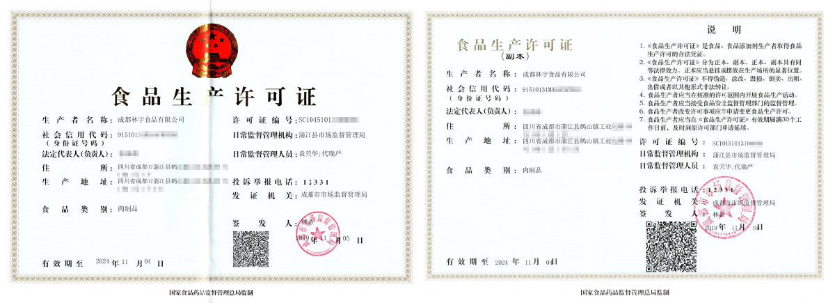成都林宇食品有限公司,经营范围肉制品及副产品加工。本次申报产品为肉制品。