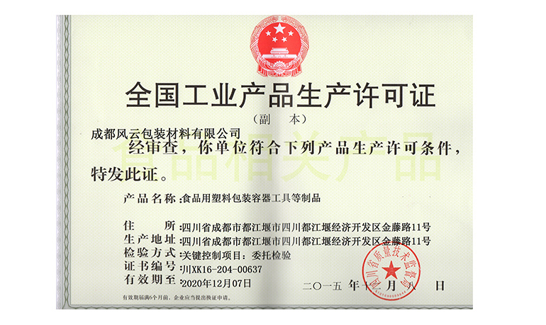 热烈祝贺成都风云包装材料有限公司获得全国工业产品生产许可证