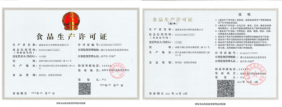 华盛兴邦食品生产许可证案例介绍,成都金米吉生物科技有限公司食品生产许可证展示。咨询热线:181-0821-4725