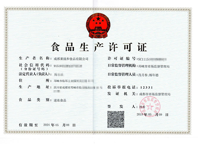 华盛兴邦食品生产许可证案例介绍,成都莱燚和食品有限公司食品生产许可证展示。咨询热线:181-0821-4725