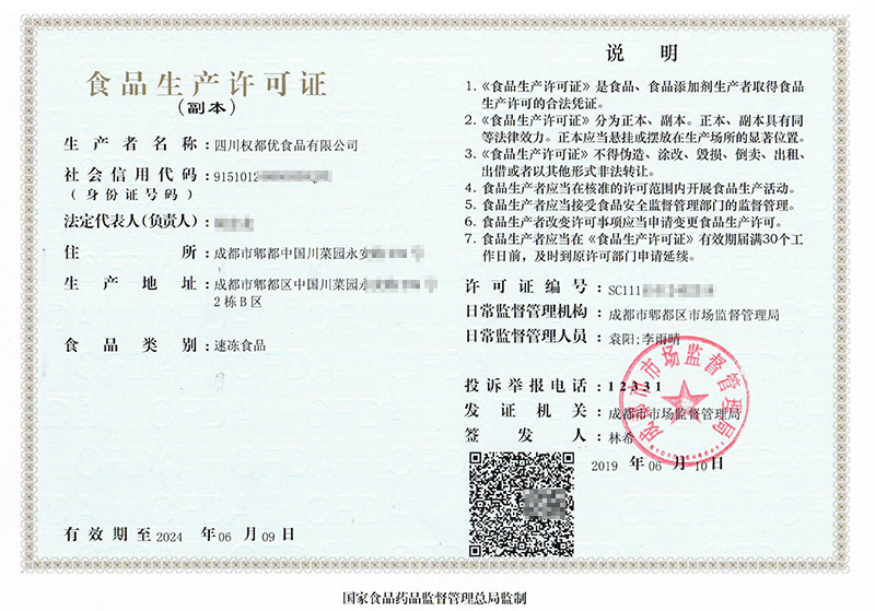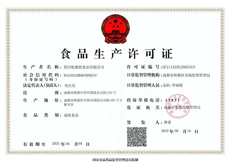 华盛兴邦咨询生产许可证案例——四川权都优食品有限公司生产许可证证书展示。咨询热线:181-0821-4725