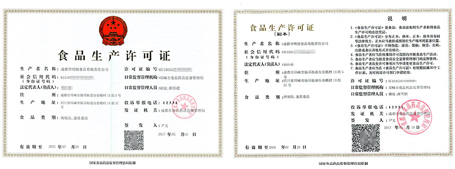 华盛兴邦食品生产许可证案例介绍,成都市明扬食品有限责任公司生产许可证证书展示。咨询热线:181-0821-4725