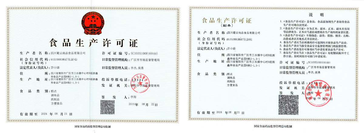 华盛兴邦食品生产许可证案例介绍,四川蜀云尚品食品有限公司食品生产许可证整数值展示,贵公司本次申报产品糕点,调味品,肉制品,方便食品。咨询热线:181-0821-4725