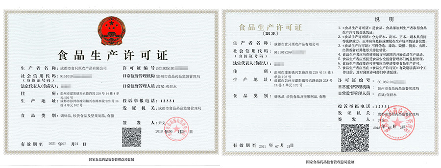 华盛兴邦炒货食品及坚果制品生产许可证案例介绍,成都食只原农产品有限公司生产许可证证书展示。咨询热线:181-0821-4725