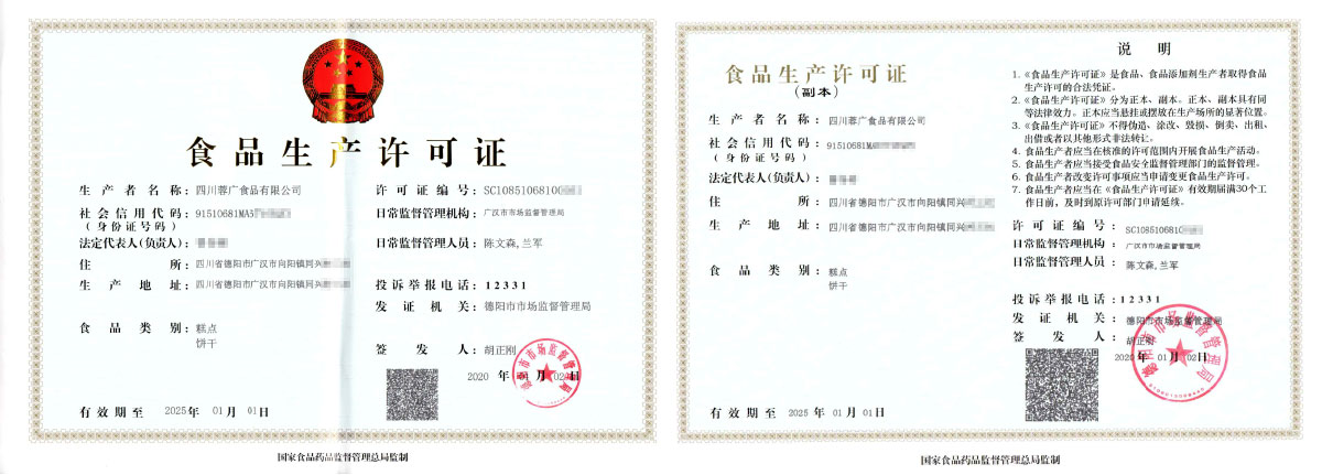 华盛兴邦糕点类生产许可证案例展示:四川蓉广食品有限公司。咨询热线:181-0821-4725