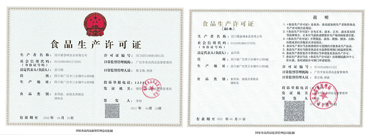 华盛兴邦食品生产许可证案例介绍,四川蜀荟峰食品有限公司食品生产许可证展示