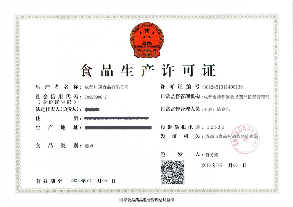 热烈祝贺川冠食品获得SC食品生产许可证书!