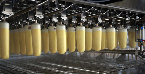 1、配料缸;2、灭菌设备;3、均质器(适用于冰淇淋、雪糕);4、热交换器;5、老化罐(适用于冰淇淋、雪糕、雪泥);6、凝冻机(适用于冰淇淋、雪糕、雪泥);7、成型设备(切割成型、模具成型、灌装成型);8、包装机(若成型方式为灌装成型,不再用包装机)。